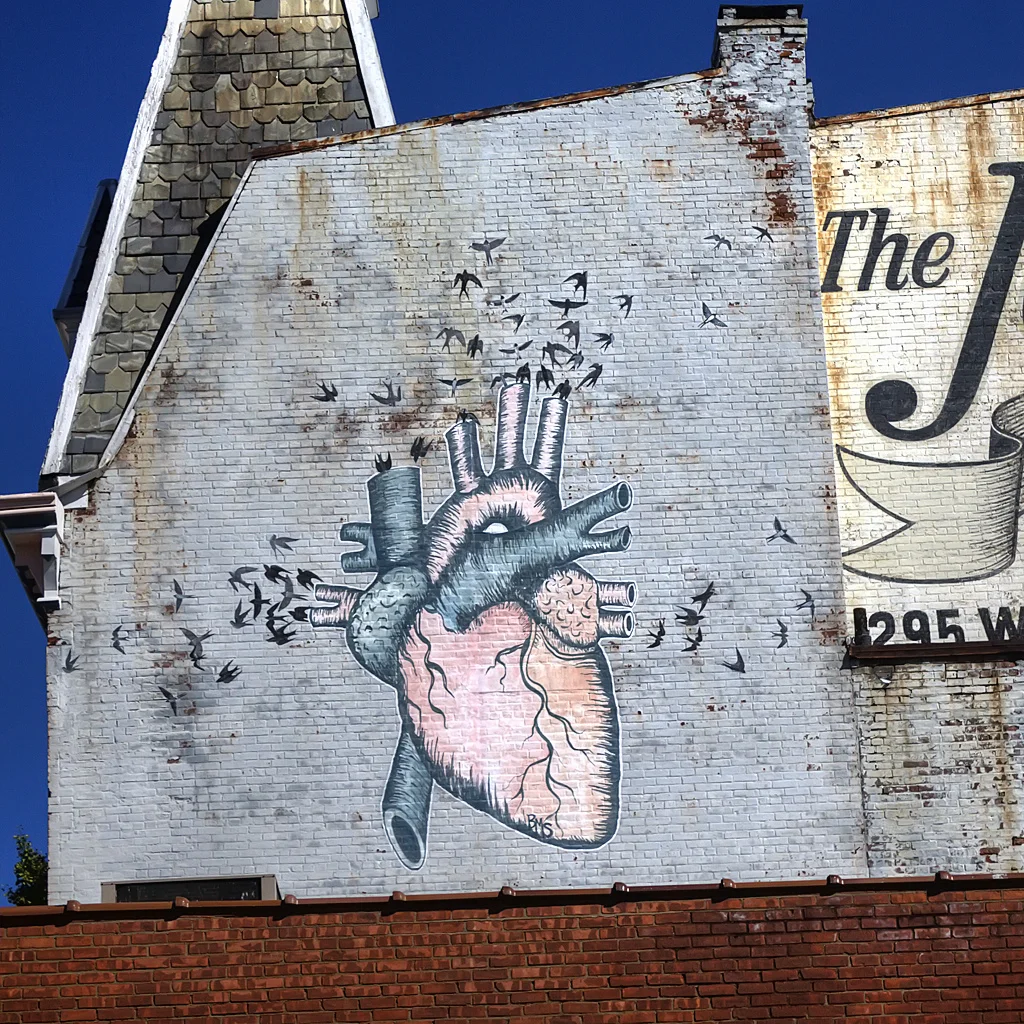 I created these street murals for the O+ Festival in Kingston, NY, an arts and music festival that promotes health care for artists and musicians. They are in a genre of street art know as "paste - ups," which are artworks painted on paper and glued to outdoor walls using wheat paste. The heart image came to me in a dream in which birds inhabited a heart made of light. The birds fly in and out in the direction of the actual blood flow in a human heart.